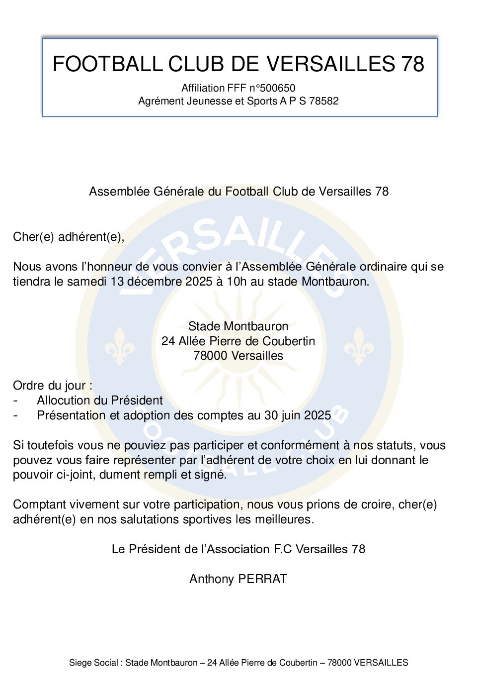 Cher(e) adhérent(e), Nous avons l’honneur de vous convier à l’Assemblée Générale ordinaire qui se tiendra le samedi 13 décembre 2025 à 10h au stade Montbauron.